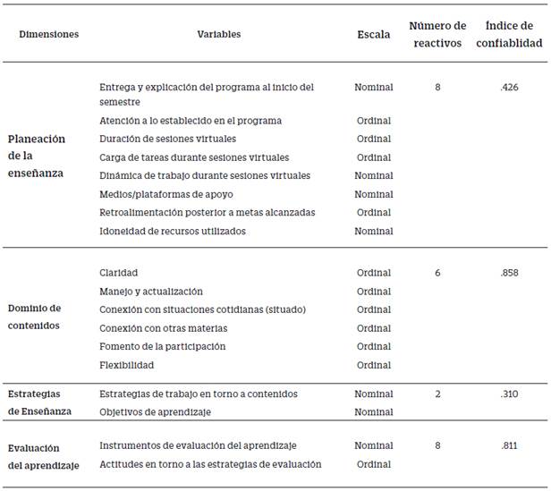 En su primera versión (Henríquez, Arámburo & Dávila, 2017 ), el cuestionario se compuso de 16 reactivos a través de los cuales se pretendía describir aspectos relacionados con la impartición presencial de clases por parte de la planta docente de la FCAYS. En el presente documento, se presentan los resultados obtenidos a partir de la adaptación de este instrumento, producto de la contingencia sanitaria causada por la propagación del COVID-19 y la impartición obligatoria de clases virtuales durante el período 2021-2. De esta manera, algunos reactivos debieron ser modificados y otros incorporados para indagar la perspectiva del alumnado acerca del desempeño de sus docentes en torno a las mismas dimensiones, pero en condiciones de clases virtuales mediadas por plataformas y medios digitales. En la Tabla 2 se muestra la distribución de las dimensiones, variables, escalas de medición, número de reactivos y los índices de confiabilidad a través del coeficiente de Alfa, de cada dimensión del instrumento: