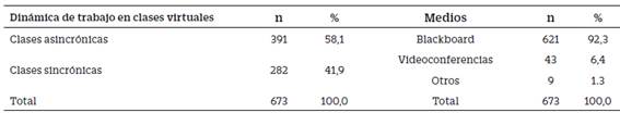 Como se observa en la Tabla 3, para indagar la dinámica de trabajo que los docentes privilegiaron en el desarrollo de sus clases durante la contingencia sanitaria (variable dentro de la dimensión Planeación de la enseñanza, ver Tabla 2), se presentaron dos opciones a los estudiantes: i) clases asincrónicas: referidas a actividades planificadas con anticipación, objetivos y tareas planeadas con fechas preestablecidas, entrega de productos en plataformas digitales, clases virtuales de corta duración para esclarecer dudas y aclarar contenidos; y ii) clases sincrónicas: en las que el docente siguió impartiendo la materia como normalmente lo hace de manera presencial, sin variar sus estrategias (clases en los horarios normales, exposición de contenidos por videoconferencia y duración de clases similar a las presenciales). Aunque los porcentajes de opinión entre ambas opciones se mostraron equilibrados, la mayoría de estudiantes (58,1%) aseveró que sus docentes privilegiaron dinámicas asincrónicas de trabajo. Para esto, se apoyaron principalmente en la plataforma Blackboard (92,3%), la cual permite administrar los contenidos de los cursos en diversas modalidades (presencial, semi-presencial, virtual) y ofrece diversos medios de comunicación (chat, mensajería, videoconferencias) entre docentes y estudiantes. No obstante lo anterior, llama la atención que más del 40% de los participantes aseveraron que sus docentes continuaron con una dinámica de trabajo sincrónica durante las clases virtuales en contexto de COVID.