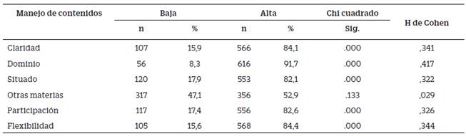 Respecto al dominio de contenidos por parte de los docentes durante la contingencia sanitaria, se indagó a través seis ítems (ver Tabla 2) en los que los participantes debían aseverar la frecuencia baja (nunca, algunas veces) o alta (casi siempre, siempre) con la que el profesorado enseñó los contenidos de manera clara, con un buen dominio y conocimiento actualizado, conectándolos con situaciones o problemas de la vida cotidiana (situado), relacionándolos con contenidos de otras materias, fomentando la participación activa de los estudiantes y con flexibilidad frente a situaciones que requerían de su atención especial. Como se puede observar en la Tabla 4, en todos los ítems la opinión de los estudiantes arrojó porcentajes de frecuencia alta (sobre el 80%) respecto al manejo de contenidos por parte de sus docentes; excepto la conexión que establecen los docentes entre su materia y otras asignaturas del plan de estudios. En este aspecto, cerca de la mitad de los estudiantes (47,1%) aseveró una frecuencia baja de ejecución por parte del profesorado. Cabe destacar se ejecutaron análisis estadísticos para contrastar las frecuencias observadas y las teóricamente esperadas (chi-cuadrado, X2) en todas las categorías, arrojando valores estadísticamente significativos (sig.=.000; 95% de confianza) para todos los casos; a excepción del manejo situado de contenidos (asociándolos con situaciones de la vida real) por parte de los docentes, en el cual las diferencias entre las frecuencias no fueron significativas (sig.=.133). Con el propósito de complementar los resultados anteriores, se ejecutaron análisis para comparar las proporciones de cada categoría (estimador de tamaño del efecto, ETE) por medio del indicador H de Cohen. En todos los casos, los valores obtenidos se encuentran entre <0.2 y >0.5, lo que denota un grado de tamaño del efecto intermedio (Khalilzadeh & Tasci, 2017 ). Destaca la categoría que remite a la relación que establecen los docentes entre su materia y los contenidos de otras asignaturas, en que el indicador arrojó un valor >0.2 (efecto mínimo).