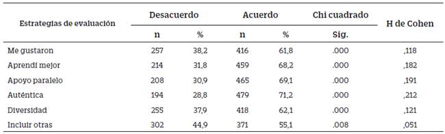 Respecto a las estrategias de evaluación del aprendizaje utilizadas por sus docentes, a nivel general se observó una opinión positiva por parte del estudiantado de FCAYS (Tabla 6): más de la mitad de los participantes estuvieron de acuerdo en el gusto por dichas estrategias (61,8%) y más de dos tercios coincidieron en que aprendieron de mejor manera, que sus docentes los apoyaron de manera paralela a la aplicación de instrumentos y que aplicaron estrategias relacionadas con los principios de la evaluación auténtica. No obstante lo anterior, llama la atención que cerca de la mitad de los estudiantes (44,9%) opinaron que sus docentes deben incluir otras estrategias de evaluación del aprendizaje, aparte de las utilizadas. En este caso, también se ejecutaron análisis de contraste entre las frecuencias observadas y las teóricamente esperadas (chi cuadrado, X2) en todas las categorías, arrojando índices estadísticamente significativos para todos los casos (95% de confianza). Nuevamente, con el propósito de complementar los resultados anteriores, se ejecutaron análisis para comparar las proporciones de cada categoría (estimador de tamaño del efecto, ETE) por medio del indicador H de Cohen. En todos los casos, los valores obtenidos se encuentran cercanos o bajo 0.2, lo que denota un grado de tamaño del efecto mínimo (Khalilzadeh & Tasci, 2017 ).