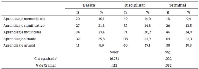 En la Tabla 7, se observan los resultados de un análisis estadístico no paramétrico (chi-cuadrada) realizado con base en la opinión de los estudiantes acerca de los objetivos de enseñanza según su etapa formativa dentro de sus respectivos planes de estudio. Lo anterior con el propósito de evidenciar eventuales diferencias significativas en la opinión de los estudiantes a partir de esta última variable, contrastando la hipótesis de independiencia entre ambas. Mientras los estudiantes de la etapa básica identificaron el aprendizaje individual como el objetivo de enseñanza mayormente promovido por sus docentes (27,4%), aquellos que se encontraban cursando las etapas formativas disciplinar y terminal mencionaron el aprendizaje situado como objetivo de enseñanza principalmente fomentado por sus profesores (33,9% y 33,3%, respectivamente). Como se puede observar, los resultados del análisis inferencial realizado indicaron diferencias significativas, con un índice de sig=.032 (95% de confianza). Sin embargo, el tamaño del efecto (V de Cramer) arroja un valor igual a .112, el cual denota una asociación débil (aunque significativa) entre las variables objetivos de enseñanza y etapa formativa de los estudiantes.
