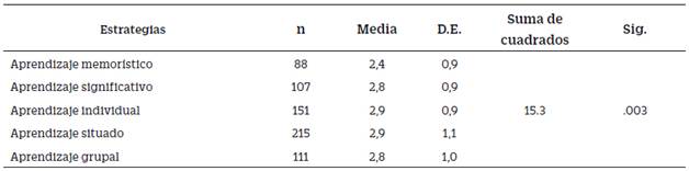 Por último, un análisis similar se realizó con base en la opinión del estudiantado acerca de las estrategias de evaluación del aprendizaje que utilizan sus docentes: se obtuvo la media global para compararla según los objetivos de enseñanza que persiguieron a través de sus clases virtuales en contexto de pandemia. Igualmente, el conjunto de ítems (seis en total) se midieron por medio de una escala de Likert de cuatro pasos: totalmente en desacuerdo (0), en desacuerdo (1), de acuerdo (2) y totalmente de acuerdo (3). Con base en esto, se obtuvo el promedio del total de puntuaciones en torno a la opinión acerca de las estrategias de evaluación del aprendizaje. Como se observa en la Tabla 9, nuevamente el objetivo de enseñanza relacionado con la promoción del aprendizaje memorístico fue el que arrojó la media más baja dentro de la opinión del estudiantado (2,4). Se ejecutó un análisis paramétrico de comparación de medias (ANOVA) para analizar las diferencias estadísticas: el resultado arrojó un índice de significatividad de .003, del cual se infieren diferencias estadísticamente significativas respecto al resto de los objetivos de enseñanza. En este caso, el indicador de tamaño del efecto (ETA cuadrado) arrojó un valor de 0.024, el cual se considera bajo (sig.=.003), con relación a las diferencias entre los valores de la media del índice de opinión acerca de las estrategias de evaluación obtenida para cada objetivo de enseñanza (Cárdenas Castro & Arancibia Martini, 2014).