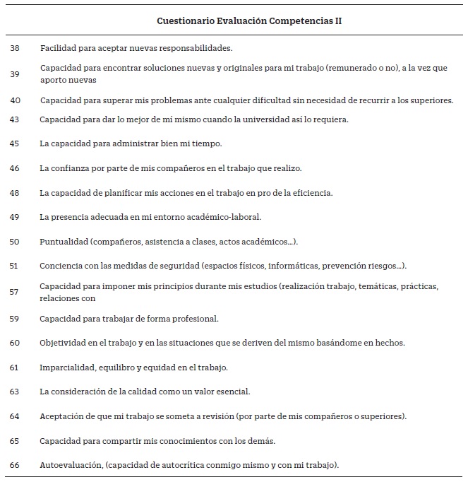 Introduction: Transversal competences constitute a key element for the academic-professional training and sociolabour insertion of university students. Numerous studies reveal a gap between the level of generic skills and the level demanded by the labor market. The evaluation of these competencies becomes essential in university education, so it is necessary to have valid evaluation tools.