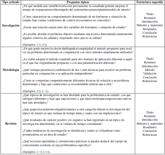 Pretendemos con esta tipificación ofrecer lineamientos más que directrices, previendo que es posible encontrar artículos que se acomoden fácilmente a alguna de las casillas, o se traslapen en varias de ellas o inclusive no encajen en ninguna, en cuyo caso se abrirá la posibilidad de un debate académico más amplio. De hecho esperaríamos que la tipificación se enriquezca y evolucione conforme la dinámica propia que la Revista le confiera. Por el momento complementaremos la guía con un cuadro sinóptico de las preguntas típicas en cada categoría, así como la estructura sugerida para organizar su contenido y referencias a trabajos recientemente publicados en la Revista, a manera de ejemplos.
