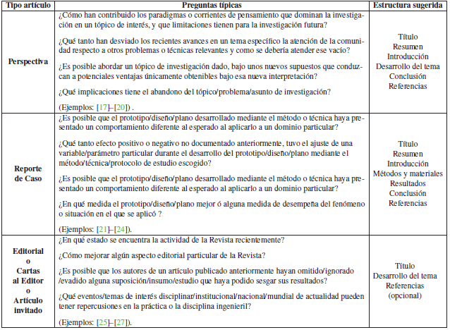Perspectiva: aquellos que, recurriendo a fuentes bibliográ ficas originales y con un discurso argumentativo y controversial, cuestionan el actual estado del arte o de la técnica, proponen visiones alternativas a las corrientes de pensamiento dominantes, critican la vanguardia de la disciplina o instigan un viraje hacia tópicos de investigación abandonados o desentendidos por la comunidad científica. Usualmente má s que una reflexión personal, buscan establecer una posición colectiva (de comunidad científica), sustentada en una discusión que combina introspectiva, retrospectiva y prospectiva sobre el asunto en cuestión.