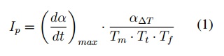 Donde Ipes el índice de pirólisis (%2·/(s · °C3),(dα/dt)max( %/s) la máxima velocidad de pérdida de peso,Tm(°C) la temperatura a la máxima velocidad de pérdida de peso,Tila temperatura inicial de degradación yTfla temperatura final de degradación. Las temperaturas inicial y final de degradación se obtienen a conversiones de 5 y 95 % respectivamente,Tmse obtiene a (dα/dt)maxy αΔT ( %) es la diferencia de conversiones al inicio y al final de la etapa de degradación y tiene un valor del 90%, el cual es finjado por Deng et al.3.
