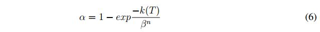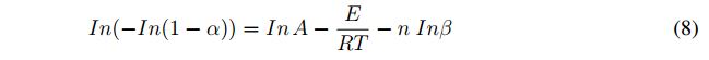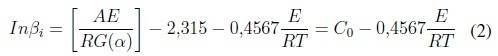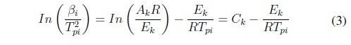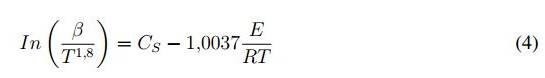 Aquíβes la velocidad de calentamiento,Res la constante universal de los gases, Cses una constante yTes la temperatura absoluta. Para una conversión dada la anterior ecuación se grafica, obteniendo una línea recta con pendiente -1.0037E/R, de la cual se calcula el valor de E. Esta ecuación, al igual que la ecuación de los métodos FWO y KAS, considerando que la velocidad de degradación es función de un término que depende de la temperatura (k(T)), conocido como la constante de reacción, y un téermino que es función de la conversión, la cual esta elevada a una potencia conocida como orden de reacción 12.
