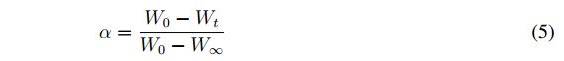 El método Starink se trabaja con la conversión del residuo, α, calculada mediante la ecuación 5, dondeW0,WtyW∞son las masas de la muestra al inicio, al tiempoty al final de la reacción, respectivamente.