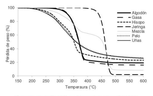 Las curvas TG de los residuos veterinarios se muestran en laFigura 1, donde en el eje de las ordenadas se ubica el porcentaje de pérdida de peso o peso remanente ( %), todas normalizadas a un valor inicial de 100 % para facilitar la comparación, y en el eje de las abscisas se grafica la temperatura en ˚C. En esta figura se observa que las temperaturas inicial y final de descomposición de todos los residuos son diferentes. Lo cual se aprecia en el cambio de pendiente de las líneas horizontales al inicio y al final de cada curva TG, respectivamente. Esto se atribuye a la diferencia en las características de pirólisis de cada uno de los residuos. En esta figura también se observa que entre 200 y 350˚C los residuos de pelo, unas e hisopos sufrieron una importante pérdida de peso de aproximadamente el 70 % respecto al peso inicial, mientras que los residuos de gasa y algodón experimentan su degradación entre 300 y 400˚C. Los residuos de jeringa muestran una pérdida de peso entre 410 y 470˚C. A 550˚C todas las muestras completaron su descomposición por pirólisis. También se aprecia que la gasa y el algodón tienen curvas de pérdida de peso similares, esto debido la composición de la gasa en su mayoría es algodón. De igual manera se observa que el residuo de mayor pérdida de peso fue la jeringa, la cual experimentó la degradación térmica a mayores temperaturas comparado con los otros residuos.