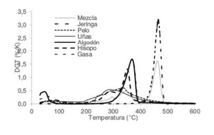 Las curvas de la termogravimetría diferencial (DTG) de los residuos veterinarios se presentan en laFigura 2. En esta figura se observa, entre 200 y 300˚C, dos picos en las muestras de unas, pelo y hisopo. Lo anterior puede indicar que existen dos etapas de degradación térmica, determinadas por la composición química y física individual de cada material analizado, lo cual juega un papel importante en su comportamiento en la pirólisis. Sin embargo, es importante resaltar que un mismo pico se puede deconvolucionar en varios picos que indicarían diferentes etapas en un mismo mecanismo de reacción. Los residuos de jeringa, gasa y algodón, solo muestran un pico, indicando que ellos se degradan bajo un único modelo de reacción. También se observa que las muestras de uñas y pelo, tienen comportamiento de degradación térmica similares, al igual que ocurre entre las muestras de hisopo, gasa y algodón. Esto se aprecia por las similitudes en el rango de temperatura de inicio y final de los picos, y que las curvas DTG de los residuos de gasa y algodón se encuentra superpuestas. De igual manera, se puede concluir que las muestras de uñas y pelo, se degradan con mayor facilidad, mientras que las muestras del cuerpo de la jeringa no se degradan tan fácilmente, debo a que requieren una mayor temperatura, comparado con los demás residuos. Esto concuerda con resultados reportados en la literatura para residuos médicos 3. Respecto a la maxima velocidad de degradación, se observa que los residuos de jeringa, gasa, algodón e hisopo, experimentan en forma descendente, las mayores velocidades de degradación térmica en pirólisis de todos los residuos.