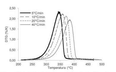 LaFigura 1muestra la variación de las curvas DTG con la velocidad de calentamiento para el residuo algodón. Aquí se observa que la máxima velocidad de degradación del algodón aumenta disminuye al aumentar la velocidad de calentamiento. Además, la curva DTG se desplaza, alejándose del eje de las ordenadas con el aumento en la velocidad de calentamiento. A pesar que aquí no se muestra, este mismo comportamiento se observó para los otros residuos incluida la muestra denominada mezcla. Similares resultados fueron reportados por Slopieckaet al.18 para la pirólisis de madera de álamo.