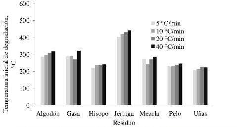 De las curvas obtenidas para cada residuo a las cuatro velocidades de calentamiento por la termogravimetría diferencial (DTG), se determinan las temperaturas características del perfil de pirólisis, las cuales se presentan en lasTabla 4, 5, 6, para las temperaturas Ti, Tmy Tfde degradación, respectivamente. En la figura 4 se observa que para la mayoría de los residuos la Tiaumenta con la velocidad de calentamiento. También se puede ver que, en promedio para las cuatro velocidades de calentamiento, el residuo de jeringa presenta el mayor valor de Ti(423˚C), seguido por algodón (303˚C), gasa (293˚C), mezcla (268˚C), pelo (237˚C), hisopo (234˚C) y uñas (217˚C). De igual manera se observa que en términos generales al aumentar la velocidad de calentamiento se aprecia un incremento de las temperaturas características, que fácilmente se puede evidenciar con un desplazamiento hacia la derecha de las curvas que describen la descomposición de los residuos. Similares resultados son registrados por Zhuet al.8, para papel adsorbente, algodón, aparatos plásticos de respiración y copitos de madera.