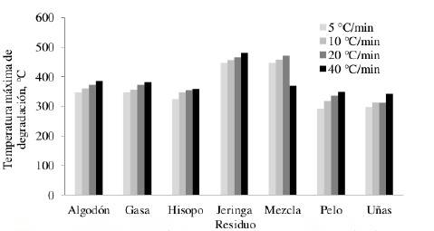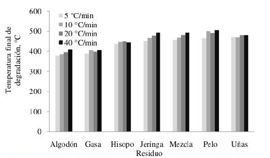 Para la temperatura máxima de pérdida de peso, que se muestra en la figura 5, se aprecia que el orden de los residuos de mayor a menor Tmes: jeringa (461˚C), mezcla (435˚C), algodon (365˚C), gasa (363˚C), hisopo (345˚C), pelo (323˚C) y unas (315˚C). Respecto a la temperatura final de degradación (figura 6) se observa que, en promedio para las cuatro velocidades de calentamiento, la Tfmayor es para el residuo de pelo (490˚C), valores similares para los residuos de jeringa (472˚C), mezcla (474˚C) y uñas (475˚C), seguido por hisopo (444˚C), gasa (399˚C) y algodon (391˚C). Si se toma las temperaturas Ti, y Tmcomo parámetros cualitativos para establecer la reactividad a la pirólisis de los residuos veterinarios, considerando el más reactivo aquel que presente el menor valor de estos parámetros, se puede decir que los tres residuos de mayor reactividad son: uñas, hisopo y pelo, y los dos de menos reactivos son: jeringa y algodón.