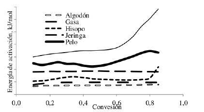 A partir del análisis termogravimétrico se estableció que los residuos veterinarios de uñas, pelo e hisopo, se degradan mediante dos diferentes mecanismos de reacción complejos de múltiples etapas, mientras los residuos de jeringa, gasa y algodón lo realizan bajo un único mecanismo, lo cual se confirma con el cambio de pendiente que se observa en las curvas de energía de activación versus conversión.