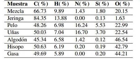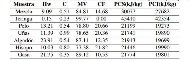 En el análisis elemental, que se muestra en laTabla II, se aprecia que el residuo de jeringas muestra el mayor contenido de carbono (C) e hidrógeno (H) y los menores contenidos de azufre (S) y oxígeno (O). Esto es debido al origen petroquímico del Poliestireno. Los residuos de jeringa y gasa no reportan contenido de nitrógeno (N) en su composición. El pelo y las uñas muestran los mayores contenidos de N, al igual que similares valores de los demás elementos, esto posiblemente se debe a que son residuos de origen animal. También se observa que el algodón, el hisopo y las gasas tienen similar análisis elemental, esto se debe a que los 3 están fabricados a base de fibra de algodón. Estos resultados complementan los análisis reportados por Dengetal. 3 y Zhuetal. 8, para residuos médicos en general.