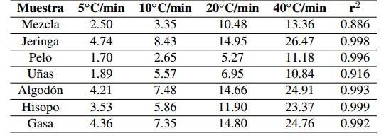 La última columna de la tabla es el coeficiente de correlación lineal, el cual muestra la relación existente entre el Ipy la velocidad de calentamiento. En todos los residuos se observa que el Ipaumenta con la velocidad de calentamiento en forma lineal, excepto para la mezcla que presenta un r2de 0.886. Al comparar el Ipa cualquier velocidad de calentamiento, los residuos con mayor capacidad a ser pirolizados son jeringa, algodón y gasa, seguidos por hisopo, mezcla, uñas y pelo. Lo anterior indica que no necesariamente los residuos que son más reactivos a la pirólisis (que inicien la pirólisis a baja temperatura), sean los que tengan la mayor capacidad a ser pirolizados.Estos resultados son comparables con los presentados en la literatura para residuos médicos 3.