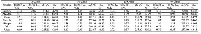 En esta tabla se observa que, para cualquier velocidad de calentamiento, la diferencia de temperatura para que un residuo se descomponga desde un 5 a un 95 %, varía segun el tipo de residuo. Por lo tanto, el orden de menor a mayor diferencia de temperatura requerida para que ocurra la degradación de los residuos veterinarios es: jeringa, algodón, gasa, mezcla, hisopo, pelo y uñas. Este mismo orden de los residuos se cumple para valores de velocidad máxima de degradación de mayor a menor. Estos resultados muestran que los residuos a base de fibra de algodón están seguidos unos de otros, al igual que ocurre con los residuos de origen animal (pelo y uñas). También se aprecia que la velocidad máxima de degradación y velocidad de conversión a la mitad de la altura del pico, disminuyen con el incremento de la velocidad de calentamiento. Mientras que la conversión para la máxima velocidad de reacción de degradación no tiene una relación directa con el aumento de la velocidad de calentamiento, dado que para algunos esta conversión aumenta (algodón, hisopo, pelo), para otros disminuye (jeringa, mezcla) y en otros no hay una tendencia clara (gasa, pelo).