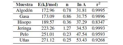 La energía de activación en cada residuo se promedió para el rango de conversiones entre 1 y 99 %, el factor frecuencia (Ln A) y el orden de reacción se calcularon de la pendiente y el intercepto de la ecuación 8, respectivamente. Estos resultados al igual que el coeficiente de correlación se presentan en laTabla V. La energía de activación es:Euñas>E pelo>Ejeringa>Ehisopo>Egasa>Ealgodón, esto indica que los residuos de algodón son más reactivos a la pirólisis que los residuos de uñas. El orden de reacción es: npelo> nuñas> nhisopo> nalgodón> ngasa> njeringa. En esta tabla también se observa que los coeficientes de correlación son cercanos a la unidad, excepto para el hisopo.