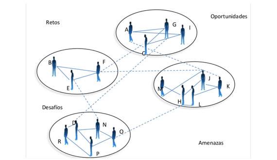 En laFigura 1, se visualiza una organización distribuida en cuatro equipos. Las personas no solo interactúan con los miembros de su equipo (líneas solidas), sino también con personas de otros equipos (líneas puntuadas), pero no todos interactúan con todos y tampoco tienen igual número de interacciones. Por ejemplo la persona A, interactúa con G y K; la persona D, interactúa con G, N, P, R. Las interacciones surgen por redes de afiliación (por ejemplo participan en el mismo equipo, son amigas, comparten información, etc.). El entorno de la organización se encuentra caracterizado por la presencia de retos, amenazas, oportunidades, desafíos, de manera amplia problemas que estimulan la generación de ideas/propuestas de acción de los miembros de la organización. En este contexto la propuesta de acción realizada por A se puede convertir en actuación conjunta en la medida en que logre influir, por ejemplo a J, este a su vez influya F, que a su vez influye a B, que su vez influye a E, este a su vez influye a N y este a O, que influye a su vez a H y este a L, y este a K, y así sucesivamente, permitiendo que la propuesta se propague por amplia proporción de la red, lo que no significa que todos hayan sido influidos de la misma manera, en la misma medida o que exista consenso. Tampoco significa que A sea el líder o el estratega, pues también hubiera podido propagarse la propuesta de M, D o de otra persona. En este ejemplo A, J, F, B, E, N, O, H, L y K, se constituyen en un Agrupamiento Percolante Vulnerable, en la medida en que son susceptibles de aceptar la propuesta de acción y se encuentran en interacción.
