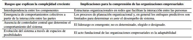 Contexto: La complejidad creciente de las organizaciones empresariales, y del entorno en el que actúan, ha llevado a que la corriente de pensamiento dominante para la comprensión de las organizaciones se torne insuficiente para dar respuesta a las condiciones cambiantes, y a la vez genere lentitud, inflexibilidad y fragilidad en la toma de decisiones, así como externalidades negativas tanto en el medio ambiente como en la sociedad. Una corriente alternativa con fundamento en las ciencias de la complejidad plantea que la adaptación vía auto-organización puede resolver este tipo de dificultades.