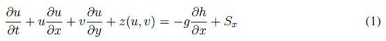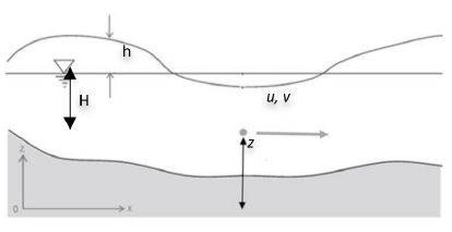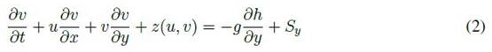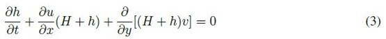 DondeHes la profundidad promedio del agua,hla perturbación de la superficie libre yu, vlas velocidades horizontales,gla gravedad,Sx ySy representan los términos fuente (fricción, viento coriolis, etc). A continuación, se muestra la forma general de las ecuaciones de aguas someras. La ecuaciones (1)(2) representan las ecuaciones de momento en las direccionesxyy. La ecuación (3) representa la conservación de masa 39.