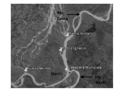 Actualmente, en épocas de invierno la región tiende a inundarse en casi toda su extensión y es por esta razón que el gobierno colombiano, a fin de controlar estos desastres construye a partir del CONPES 3421 de 2006 (Consejo Nacional de Política Económica y Social-Colombia) obras de infraestructura como compuertas, canales de drenaje y riego, estructuras de control hidráulico y algunos terraplenes o diques, para evitar desastres a gran escala. Entre ellas se encuentra un dique marginal multipropósito 31, que se encuentra localizado desde Colorado (Antioquia) hasta Achí (Bolívar) por todo el margen izquierdo del río Cauca. Este dique, durante el fenómeno de la niña de los años 2010-2011 presentó gran cantidad de fallas en las zonas más débiles (Nuevo Mundo, Pedro Ignacio y Santa Anita,Figura 2), debido al aumento de la creciente del río Cauca, generando inundaciones en una gran parte de la región. Entre los municipios más afectados se encuentra Nechí, con una población de 23.502 habitantes, en un territorio de 914 Km2(censo en Colombia del año 2011). Este territorio cuenta con una gran riqueza hídrica, ecológica y agropecuaria, pero debido a su localización está expuesto a frecuentes inundaciones. Esta situación ocasiona que el municipio no tenga un satisfactorio desarrollo económico, además causa enfermedades que afectan principalmente a niños y adultos mayores 31. Según el DANE (Departamento Administrativo Nacional de Estadística), las Necesidades Básicas Insatisfechas alcanzan el 68.13% (2011), el Índice de Desempeño Integral 44.99% (DNP, 2013), y el GINI de tierras 0.627 (UniAndes, IGAC y U de Antioquia, 2012). Dichas características hacen evidente la dependencia que tiene la población de los ríos desde el punto de vista económico y social. Por lo que resulta importante analizar el comportamiento de las dinámicas entre el uso del suelo, la población y el recurso hídrico. Los resultados del ejercicio de modelación podrían generar herramientas en el marco de la gestión de los recursos naturales en el municipio, además de fortalecer los procesos de planeación. Esto contribuiría a los procesos del manejo integral de la Cuenca.