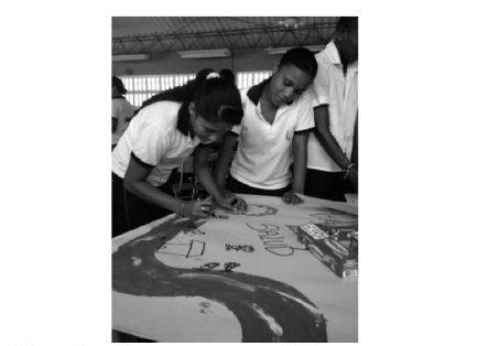 Posteriormente entre 2013 y 2015, se llevaron a cabo dos visitas a la Mojana, específicamente en los municipios de San Marcos y Nechí. En San Marcos se desarrollaron tres talleres con las instituciones educativas. El primero sobre creencias y valores y cuyo objetivo fue elaborar un diagnóstico participativo para profundizar sobre los metarelatos religiosos, las creencias populares, costumbres y valores de la población (Figura 3). El segundo, un taller de redes sociales e identidad cuyo propósito fue evaluar desde la experiencia comunitaria, elementos que ayudaran a esbozar características de la identidad local y regional, así como a vislumbrar los sueños compartidos. Por último, en el tercer taller sobre resiliencia tuvo como objetivo reconocer las cualidades y fortalezas que permiten a las personas enfrentar positivamente situaciones desfavorables. El objetivo de estos tres ejercicios tanto en San Marcos como en Nechí fue explorar los sentidos del agua, las experiencias con construcciones palafíticas en las escuelas, pero además identificar variables que debían ser incluidas en el modelo. Para el desarrollo de los talleres se acudieron a variadas técnicas de investigación de corte cualitativo; se hicieron cartografías sociales con niños y jóvenes, conversatorios comunitarios con profesores y padres y madres de familia. Además, se realizaron recorridos territoriales durante los cuales se mantuvieron conversaciones informales con los pobladores. De esta manera surge un acuerdo para iniciar un proceso de formación comunitaria en modelación que permita fortalecer los procesos de toma de decisiones en los municipios. La pertinencia de esta formación se justifica en graves hechos precedentes. Por ejemplo, en el caso del municipio de Nechí se perdió un programa de construcción de viviendas, dado que no se conocían con claridad los niveles que podría alcanzar el agua en la zona en periodos de inundación, por lo que la comunidad considera que comprender la relación entre las dinámicas hídricas y elementos sociales puede apoyar el conocimiento del territorio y la posterior toma de decisiones. Como resultado de estos ejercicios se identificó conjuntamente con la población local, una serie de variables iniciales que apoyaron la construcción del modelo presentado en esta investigación. Una vez la herramienta sea implementada se hará un ejercicio adicional de formación y validación con las comunidades locales, que además le otorgue sentido y legitimación al proceso de modo que pueda ser apropiado por la población.