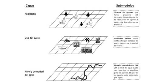 Las poblaciones humanas (La capa de población) están representadas por un sistema de agentes que toman provecho del suelo para mejorar sus ingresos, sin embargo, la no adaptación a las condiciones de inundación puede degradarla. La interacción de los agentes con el suelo conlleva al mejoramiento o empobrecimiento del mismo. Con los niveles del agua (la capa nivel y velocidad del agua) arrojados por un modelo hidrodinámico (plataforma ISIS 2D), se simula una inundación que se produce periódicamente 33. El nivel de agua en las unidades territoriales puede ser atractivo o repulsivo para los agentes (dependiendo del su nivel de adaptación en zonas con inundación y secas). La presencia periódica de la inundación, la capacidad de regeneración y modificación del territorio, sumadas a la posibilidad de cambio en los agentes hacen que el territorio se caracterice por exhibir un entorno variante en el tiempo 32.