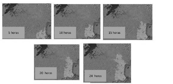 En esta sección son presentados los principales avances de la modelación integrada. En laFigura 6se muestra el comportamiento de los niveles del agua en el municipio de Nechí. Estos permiten representar la mancha de inundación y a su vez se convierten en el principal insumo para el modelo integrado de agentes. El Modelo Digital de Elevación usado es el de la NASA 44, que tiene una resolución de 30x30 m. Los lugares por donde ha fallado el dique y la entrada del agua al pueblo son las condiciones de contorno y se usan los datos del nivel del agua (Nuevo Mundo: 3 m, Pedro Ignacio: 1;5 .. 2 m, Santa Anita: 1;5 .. 2 m y muralla: 0;5 .. 1 m). Estos puntos y niveles de agua fueron tomados a partir de una visita de campo. Adicionalmente para los limites no predefinidos como condición de contorno en el área activa, el programa impone una condición de no flujo. La condición inicial es seca, es decir que en todo el dominio no hay agua. Es elegida una rugosidad de 0;03 en el número de Manning. Respecto a los parámetros numéricos, se determinó un tamaño de paso de tiempo .t = 2s, con el cual se garantiza un CFL no mayor a 1.5, lo cual garantiza la estabilidad del modelo numérico y evita la presencia de oscilaciones indeseadas. El tiempo de simulación es de 24 horas con el fin de observar la mancha de inundación.