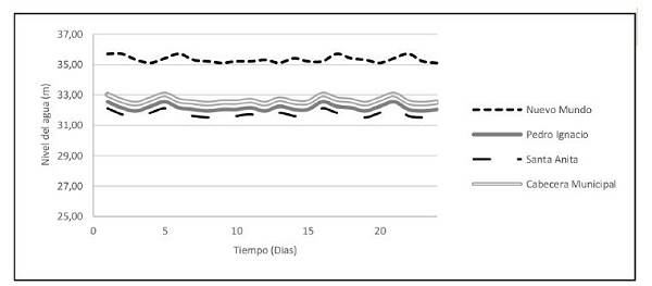 A partir de estos resultados, se observa cómo el flujo se propaga hacía la margen derecha del río y empieza su tránsito al interior de la ecorregión de la Mojana. Lo que afecta principalmente la población asentada en el área aferente al río Cauca. En laFigura 7se observa la variación de la superficie libre del agua, en los puntos que ha fallado el dique. Estos niveles representan la dinámica del río que varía entre 31-36 m, evidenciando la amenaza por inundación. Este tipo de información es útil para: (i) la generación de un sistema de alertas tempranas, (ii) ubicación de asentamientos y el (iii) manejo de actividades productivas, entre otras.