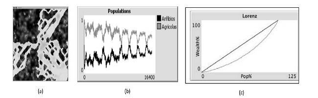 Asimismo, estás últimas dan lugar a la configuración de tres clases sociales alta, media y baja (i.e. High, Medium, Low). Cuando el tiempo de búsqueda de un agente se agota, este puede cambiar su condición de anfibio a agrícola o viceversa 32. El agotamiento es función de presiones selectivas del ambiente sobre el agente. Con estas condiciones se calcula el coeficiente de GINI que representa la desigualdad en el territorio; pero además se puede analizar el nivel de vulnerabilidad (en el marco de la gestión del riesgo) de la población frente al fenómeno de la inundación.