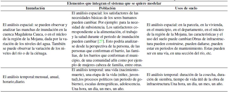 La integración de escalas. Los componentes de un sistema pueden operar a diferentes escalas espaciales y temporales. Para examinar aspectos de hidrología los límites de las cuencas pueden ser los más apropiados, sin embargo, cuando se consideran aspectos sociales y económicos, estas escalas pueden variar a hogares, granjas, instituciones grupos sociales, o entidades. La selección de la escala tiene en cuenta (i) la escala de interés para los usuarios o actores interesados, (ii) la escala a la que los procesos pueden ser representados, (iii) el vínculo entre los componentes del modelo que representan los procesos en diferentes escalas y (iv) las limitaciones prácticas tales como datos, capacidad computacional, cubrimiento de la población en términos de conocimiento experto. En laTabla Ise presenta un ejemplo, donde se puede observar un análisis de escalas temporales y espaciales para la ecorregión de la Mojana.