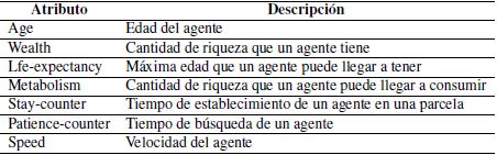 Se consideran dos tipos de agentes que representan el comportamiento de la población en la Mojana: agrícolas y anfibios que a su vez pueden adoptar dos estados: buscadores y asentados. Los atributos de los agentes se resumen en laTabla II. Al comienzo el sistema inicializa el número total de agentes (agrícolas y anfibios); para cada uno de los cuales las rutinas son las mismas por población (i.e. buscar, moverse, asentarse, reproducirse y morir). La principal diferencia entre los dos tipos de agentes consiste en que el proceso de asentarse depende de la condición del suelo (i.e. seco o inundado). Las rutinas están predefinidas en función de la riqueza de las parcelas, no obstante su incremento y estabilidad dependen adicionalmente de la velocidad de búsqueda (i.e speed) y de la riqueza acumulada.