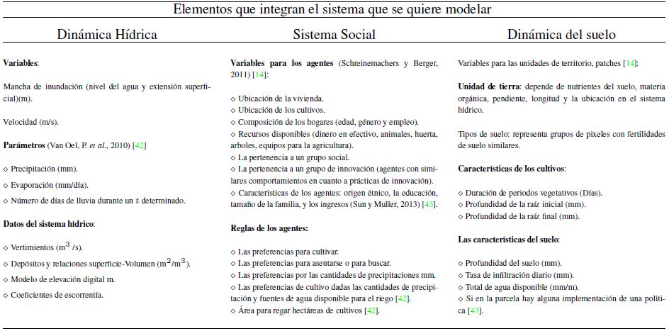 Los agentes son un sistema autónomo y proactivo capaz de interactuar con otros agentes para satisfacer sus objetivos. Entre las características principales de los agentes se encuentra que son: autónomos, proactivos, situados y dirigidos por entidades de software 40. En el marco de la modelació integrada, los sistemas de agentes permiten la simulación de los muchos futuros posibles emergentes de sistemas complejos, son herramientas de apoyo para la toma de decisión y ofrecen a los gestores de recursos naturales con la capacidad de comprender mejor la dinámica actual de su sistema 1. En laTabla IIIson presentadas posibles variables y reglas a usar a futuro en el modelo de agentes para el municipio de Nechí. La participación de los actores durante el proceso de modelación ha resultado fundamental, de tal manera que (i) se logra comprender el funcionamiento de la herramienta, (ii) los actores pueden contribuir a la generación de variables y reglas (ii) la herramienta puede ser ajustada según la visión de los actores y se logra la (iii) generación de esce narios. Además, se considera como parte fundamental del proceso de modelación participativa el rediseño de la herramienta y retroalimentación continúa. De manera paralela el equipo de modelación realiza un ejercicio de análisis del funcionamiento de la herramienta y planteamiento de escenarios.