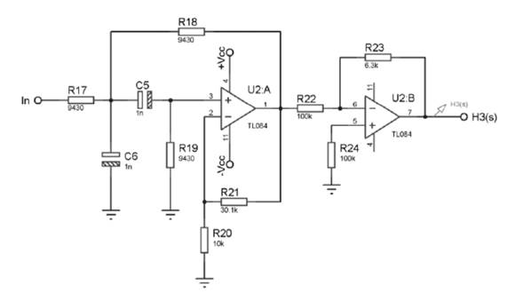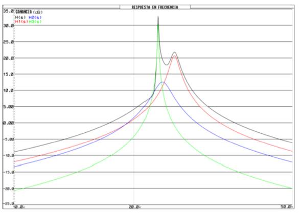 Para simplificar la realización circuital de estos subsistemas se optó por eliminar el componente de s0 de cada numerador, pues esta situación no generó cambios significativos en el diagrama de Bode de la función de transferencia original. Las funciones de transferencia de los sistemas finalmente implementadas se presentan en las ecuaciones (11), (12) y (13) donde se realizó además una normalización para compensar la ganancia de la red Sallen- Key. Estos filtros deben interconectarse como se ilustra en la Figura 1, dando lugar al banco de filtros. En la ecuación (14) se muestra el sistema final implementado, el cual contiene los cambios mencionados sobre las funciones de transferencia originales de los subsistemas.