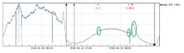 Desde la entrada en operación del filtro desarrollado se han registrado seis explosiones solares clase C, de acuerdo a la escala de intensidad establecida por National Oceanic and Atmospheric Administration (NOAA, por sus siglas en inglés). Las Figuras 11, 12 y 13 presentan las tres detecciones más potentes registradas por el sistema desde su entada en operación, tomadas directamente de la base de datos de Stanford Solar Center de Stanford University [23].