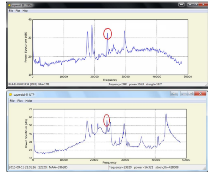 La Figura 14 permite observar el aspecto final del radio receptor desarrollado, la antena tipo lazo rectangular con la que se cuenta en el Observatorio Astronómico de la UTP, y el programa SuperSID de Stanford Solar Center, que adelanta la captura, visualización y almacenamiento de los datos recibidos. Entre tanto, la Figura 15 ilustra la densidad espectral de potencia de la señal capturada por el antiguo radio receptor (arriba) y del presentado en este trabajo (abajo). Las elipses rojas identifican el armónico en 24 kHz correspondiente a la señal de baja frecuencia emitida por la estación NAA. Nótese que en el nuevo radio receptor este armónico es el más intenso de todo el espectro, alcanzando una potencia de 56.321 dB, en contraste con los 32.517 dB arrojados por el antiguo sistema basado en el esquema de Stanford Solar Center.