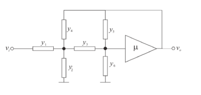 De la anterior matriz se obtiene que la función de transferencia de la red Sallen-Key está dada por [16]: