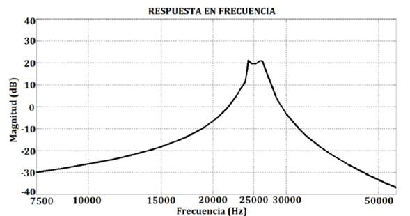 El diagrama de Bode del filtro de la ecuación (14) se observa en la Figura 5. Nótese que se trata de un filtro pasa banda de alta selectividad, centrado alrededor de 25 kHz.
