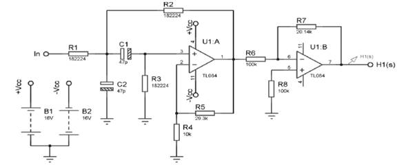 Sin embargo, los sistemas de filtrado registrados en el estado del arte presentan la desventaja de que están basados en metodologías aplicables únicamente a frecuencias muy específicas, alejándolos de aplicaciones particulares con frecuencias poco comunes, como es el caso de la estación de baja frecuencia NAA. Además, los elementos involucrados en estos diseños y su posterior ensamble exigen tecnologías de elaboración de circuitos impresos de difícil acceso y que, por lo tanto, demandan altos costos de desarrollo. De esta forma, con el fin de construir el radio receptor de banda estrecha centrado en 24 kHz presentado en este artículo, se desarrolló una novedosa estrategia alternativa para el diseño y la realización circuital de filtros activos analógicos de orden superior, basada en la descomposición de la función de transferencia original en subsistemas de primero y segundo orden, implementados a partir de integradores y redes Sallen-Key basados en amplificadores operacionales de uso común y bajo costo.