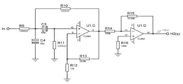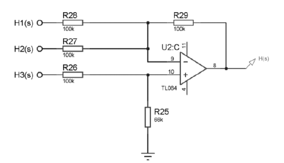 Al igualar la función de transferencia general de la red Sallen-Key presentada en la ecuación (18) con las funciones de transferencia deseadas dadas por las ecuaciones (11), (12) y (13), se obtuvieron los circuitos que se presentan en las Figuras 6, 7 y 8, respectivamente. Finalmente, la Figura 9 presenta el sumador final que permite realizar el banco de filtros de acuerdo a lo indicado en la Figura 1, mientras que la Figura 10 ilustra la respuesta en frecuencia del sistema obtenida en Proteus.