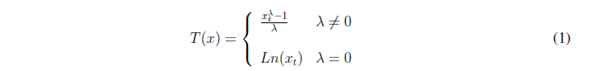 A las series de tiempo no estacionarias en varianza se requiere realizar la transformación de estabilización de su varianza, para que esta sea constante. George E. P. Box y David Cox en 1964, propusieron aplicar transformaciones de potencias [23 ], [24 ],como se indica en la ecuación 1.