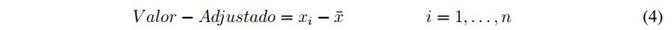 Es sugerido que para la transformación los valores no deben tener media diferente de cero, esto se consigue restando cada valor del promedio en cada columna (variable) como se muestra en la ecuación 4.