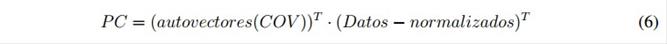 Se obtienen los autovalores y los autovectores de la matriz de covarianza, esto permite obtener las componentes principales (Principal Component-PC) como lo indica la ecuación 6.