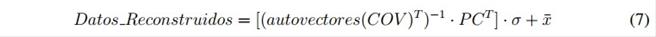 Después de cualquier proceso realizado sobre las componentes principales, es necesario hacer la transformación inversa reconstruyendo los datos con el fin de retornar a las dimensiones originales mediante la ecuación 7; esta ecuación se aplicará después de haber realizado el proceso de transformación del dominio del tiempo al dominio de la frecuencia, realizar el pronóstico y aplicar la transformada inversa del dominio de la frecuencia al dominio del tiempo.