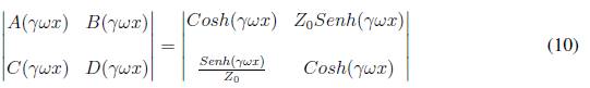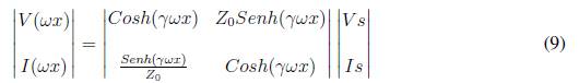 La forma matricial del modelo hiperbólico en parámetros de transmisión de una línea de transmisión se muestra con el sistema de ecuaciones (9).