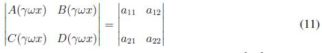 La matriz del sistema (9) tiene asociada una matriz (10) con variables hiperbolicas complejas A, B, C, D, equivalente a la matriz (11).