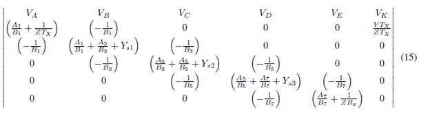 son las tensiones de los N nodos adyacentes al nodo k conectados por las N líneas de transmisión conectadas al nodo k; B% y A% son las variables hiperbolicas complejas de las impedancias de la red que conecta el nodo k con el nodo i. El sistema ampliado de ecuaciones no lineales de la topología monofásica en modelos de dos puertos y admitancia reflejada (15), aparece a continuación: