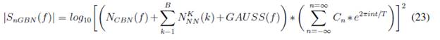 El ruido en redes BPL hogarenas es el de Fondo Generalizado (GBN: Generalized Background Noise), [23], [24], que es la superposicion del ruido de color de fondo (CBN: Color Background Noise) y los disturbios en el ancho de banda (NN: Narrowband Noise). La densidad espectral del ruido utilizada se expresa por la ecuacion (23) y en la Figura 16 se muestra la simulacion obtenida para la medicion típica del ruido, con valores de densidad espectral de potencia entre -120 dBm/Hz y -140 dBm/Hz, que se incorpora en la verificación.