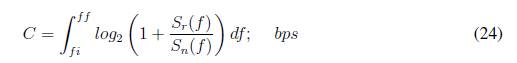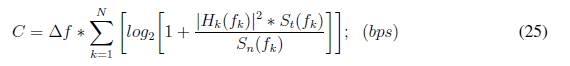 Por el teorema de Shannon-Hartley un canal analogico con ruido, con capacidad de canal segtin la ecuacion (24) se transforma en la ecuacion (25) [25], que corresponde a un canal dependiente de la frecuencia [26], [27], expresion coherente con la tecnica de transmision adoptada para sistemas BPL hogareba que es OFDM, donde en el dominio de la frecuencia se tienen N componentes de frecuencia discretos en un intervalo de frecuencia.